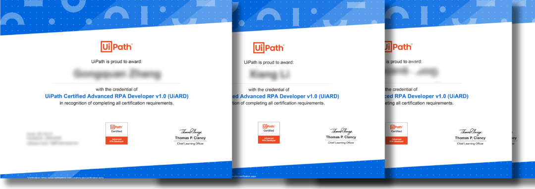 北京维普艾克 的IA团队工程师通过官方的专业培训,历经严格的理论考核和实践检测,获得UiPath高级开发人员认证。